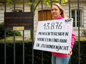 Vanwege de coronamaatregelen konden wij de petitie niet persoonlijk overhandigen. Daarom is ervoor gekozen deze op locatie in de brievenbus te doen. Net als voorgaande jaren zal de petitie worden opgestuurd naar de Canadese premier Justin Trudeau. Wij hebben ook een brief bijgevoegd waarin wij oproepen de jacht voorgoed te stoppen. Daarnaast vragen we de overheid subsidies die nu naar de jacht gaan, te investeren in diervriendelijke alternatieven als inkomstenbron en voor bijvoorbeeld het verwijderen van vissersmateriaal dat massaal de zeeën vervuilt.