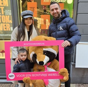 Bananencupcakes, een knalroze Instawall, onze mascotte Wally de wasbeerhond en natuurlijk de koptelefoons. Geen ingrediënt ontbrak om Fur Free Friday te laten slagen. Onze vrijwilligers huppelden voor de deur met een gigantisch reclamebord voor onze actie en lokten zo het winkelend publiek naar binnen. Eenmaal bij onze tafel kregen ze niet alleen een koptelefoon, maar konden ze ook een bonttest doen met de bontproducten die we hadden meegenomen. De mond van een bezoekster viel wagenwijd open toen ze hoorde dat het telefoonhoesje in haar hand was gemaakt van konijnenbont.
