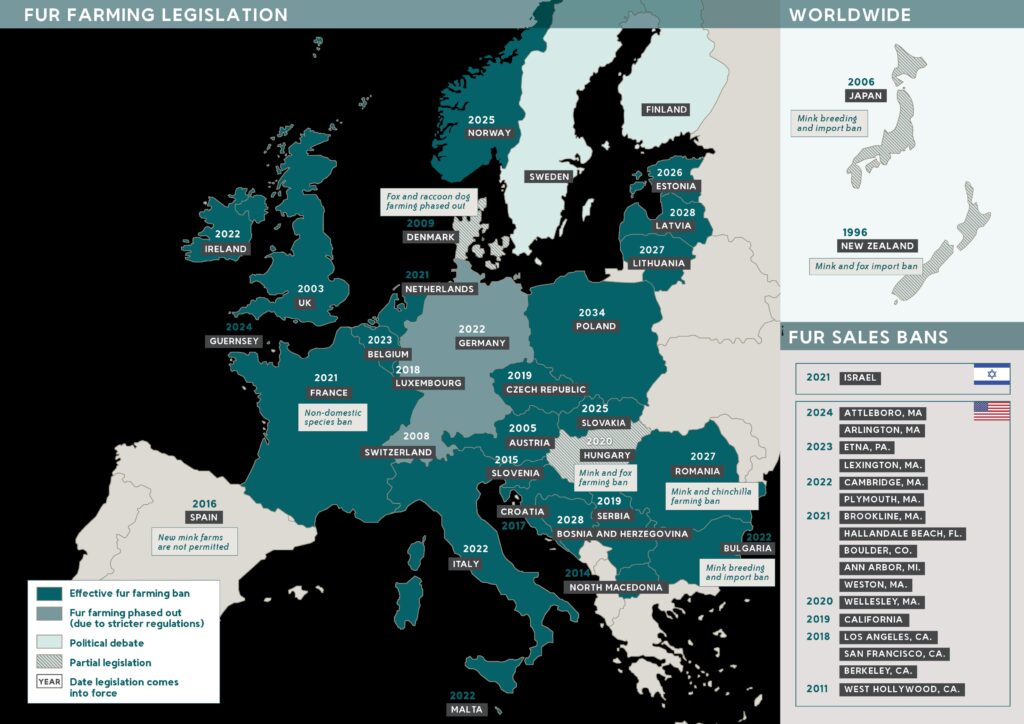 - In de afgelopen twee decennia hebben 24 Europese landen stelling genomen tegen wreedheid in de bontindustrie door een verbod op pelsdierhouderijen in te voeren en de industrie volledig uit te faseren: de 18 Europese lidstaten: Nederland, Oostenrijk, België, Bulgarije (verbod op het fokken van nertsen), Tsjechië, Slowakije, Kroatië, Slovenië, Luxemburg, Malta, Ierland, Estland, Frankrijk (verbod op het fokken van niet-gedomesticeerde diersoorten), Italië, Letland, Litouwen, Polen en Roemenië (verbod op het fokken van nertsen en chinchilla’s), plus 6 Europese landen: het Verenigd Koninkrijk, Noorwegen, Guernsey, Noord-Macedonië, Servië en Bosnië en Herzegovina. Een aantal andere Europese landen heeft de fokkerij van bepaalde diersoorten aan banden gelegd of strengere regels ingevoerd die deze praktijk effectief hebben teruggedrongen.