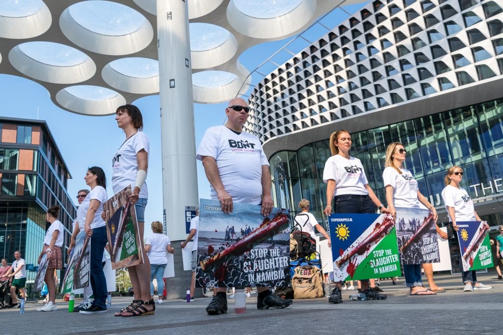 Medewerkers van Bont voor Dieren gingen het gesprek aan met omstanders die bleven staan om te kijken naar het vierkant op het plein. Zo ‘bekend’ als de zeehondenjacht in Canada namelijk is, zo weinig is er bekend over de 86.000 Kaapse pelsrobben die in Namibië tussen juli en december mogen worden doodgeknuppeld voor hun vacht. Ook weet bijna niemand dat Namibië 300 procent meer inkomsten zou genereren uit zeehondentoerisme dan uit de bontindustrie. Aan de hand van deze kennis verstuurde iedereen met wie wij in gesprek gingen onze protestmail, bedoeld voor het Namibische Ministerie van Visserij om voor eens en altijd te stoppen met de jacht. Deze mensen konden vervolgens op de foto met een protestbord met de tekst ‘Ook ik ben tegen de knuppels in Namibië’.